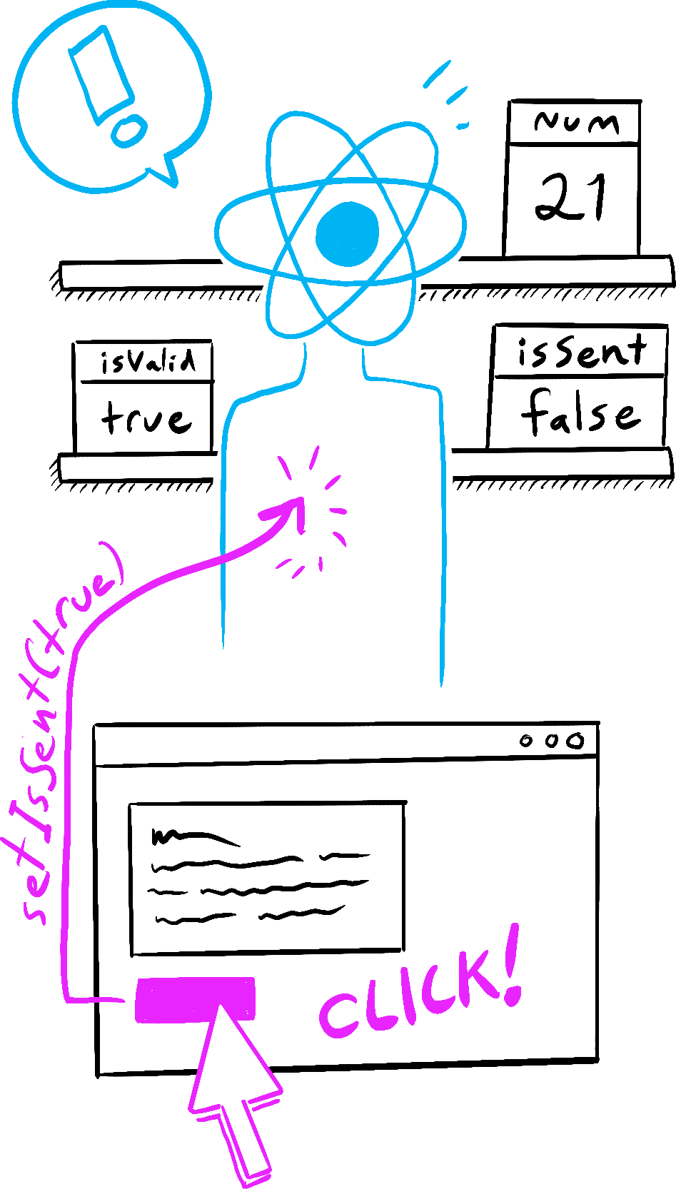 onSubmit. setIsSent(true)يعينisSentإلىtrueويضع تصييرًا جديدًا في قائمة الانتظار.- يعيد React تصيير المكون وفقًا لقيمة